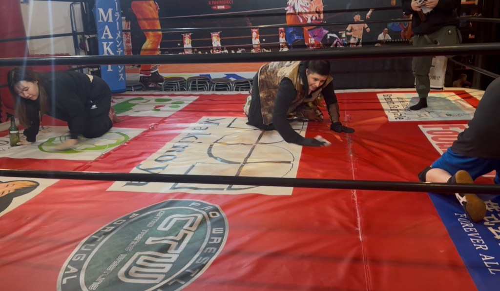 CHAnticristo limpiando el ring de HEAT-UP Pro Wrestling junto a sus compañeros de clase en Tokio, Japón